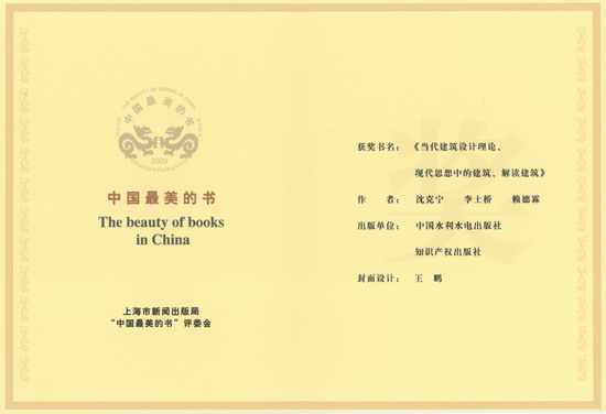 2010年11月22日上午9點, 2007—2009年度“中國最美的書”頒獎大會在上海新聞出版大樓召開。我社副社長胡昌支出席頒獎大會。由我社美編王鵬設計的圖書《建筑風雨》、《當代建筑設計理論》喜獲2007、2009年度 “中國最美的書”稱號,王鵬獲頒出版單位獎狀證書及設計者獎狀證書。