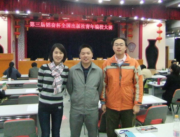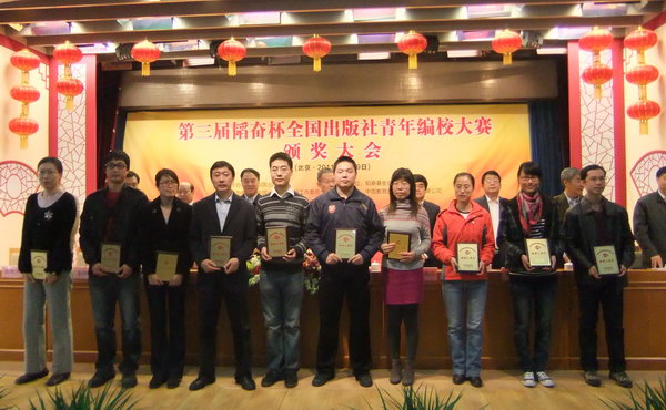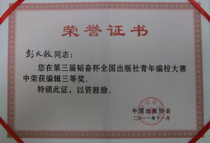 第三屆韜奮杯全國出版社青年編校大賽于11月8日在京舉行。來自全國各?。ㄗ灾螀^、直轄市)的94個代表隊、324人參賽。編校大賽分為編輯及校對兩個競賽部分,其中各取一等獎兩名、二等獎六名、三等獎十二名。我社經過內部選拔,由彭天赦、殷海軍參加編輯競賽,沈林莉參加校對競賽。最終彭天赦獲得編輯三等獎,這是我社近年來首次獲得的全國性編校大獎。