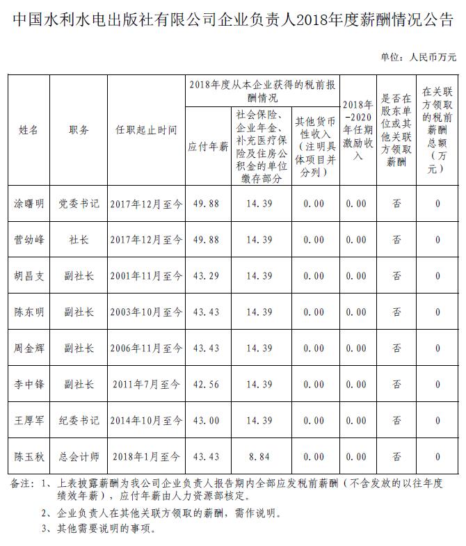 水電知識網»資訊»出版傳媒資訊»中國水利水電出版社有限公司企業負責人2018年度薪酬情況公告