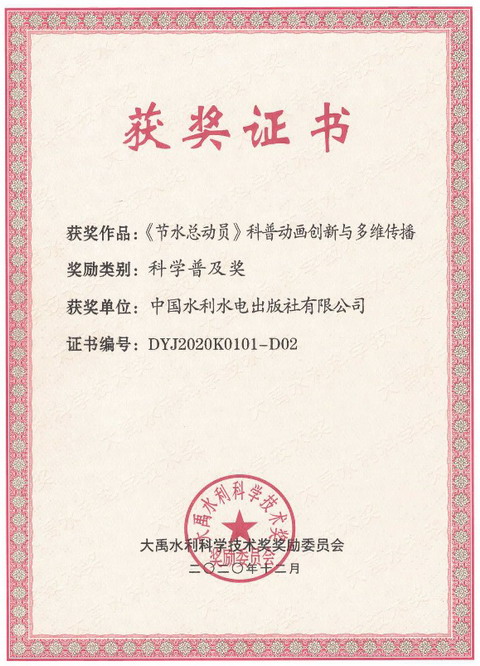 水電知識網(wǎng)»資訊»出版?zhèn)髅劫Y訊»我社“《節(jié)水總動員》科普動畫創(chuàng)新與多維傳播”項目榮獲2020年度大禹獎科學(xué)普及獎