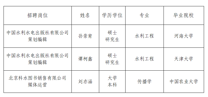 水電知識(shí)網(wǎng)»資訊»通知公告»中國水利水電出版?zhèn)髅郊瘓F(tuán)有限公司2025年度公開招聘擬聘人員公示