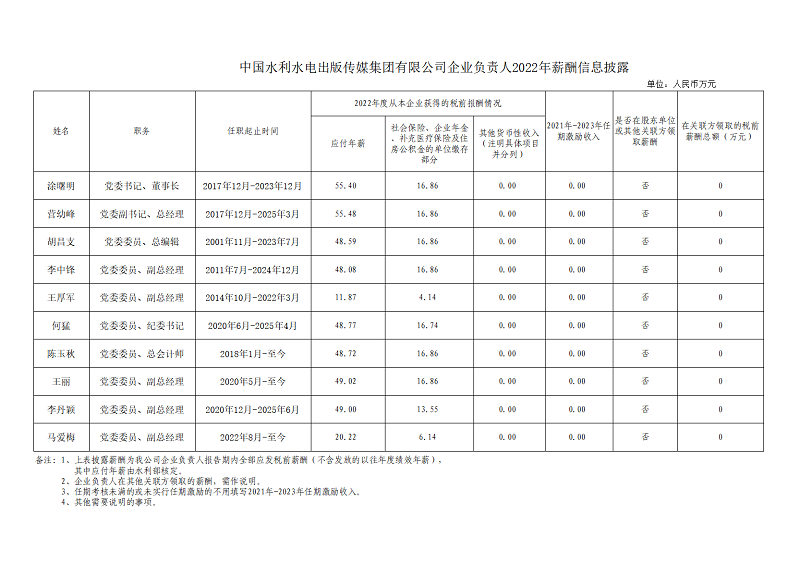 水電知識網(wǎng)»資訊»通知公告»中國水利水電出版?zhèn)髅郊瘓F(tuán)有限公司企業(yè)負(fù)責(zé)人2022年薪酬信息披露