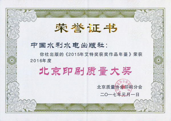 2017年3月30日,北京質量協會印刷分會在京召開工作會議,對2016年度印刷質量工作中取得優秀成績的單位和個人進行了表彰。我社土木建筑出版分社圖書《2015年艾特獎獲獎作品年鑒》榮獲2016年度“北京印刷質量大獎”。全市1700多家印刷企業報送13101種參評產品,最終獲獎產品18種, 該獎項為北京市印刷質量最高獎項。